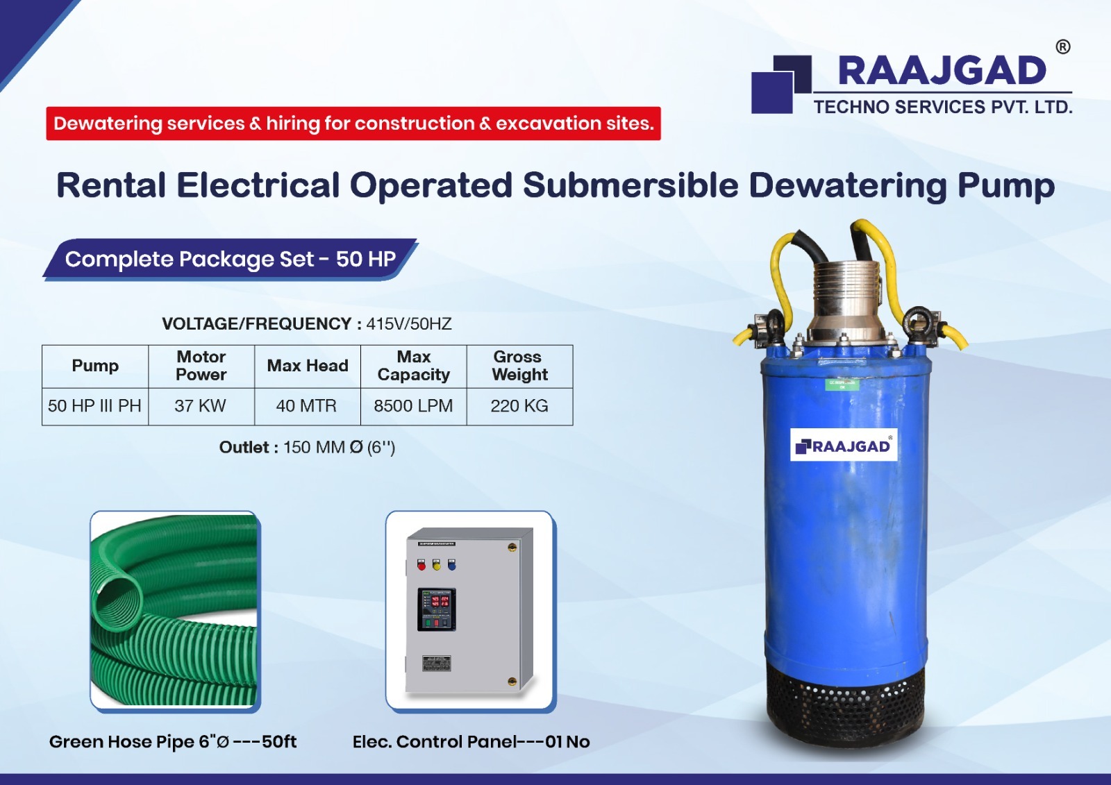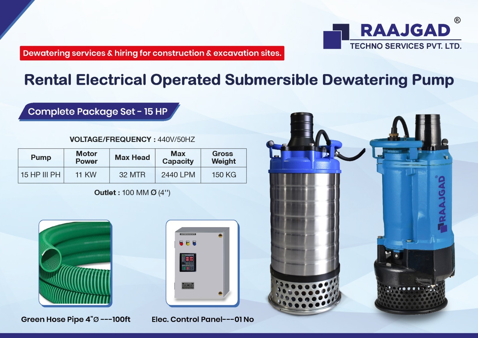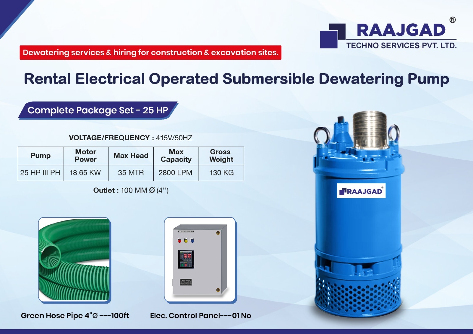 Raajgad Pump provides Submersible Pumps, Sludge Pumps for construction & excavation sites. Our dewatering rental services includes electrical Submersible mud pumps ranging from 1 HP to 100 HP, Outlet Size 2” to 10” and is used across many industries & Constructions.