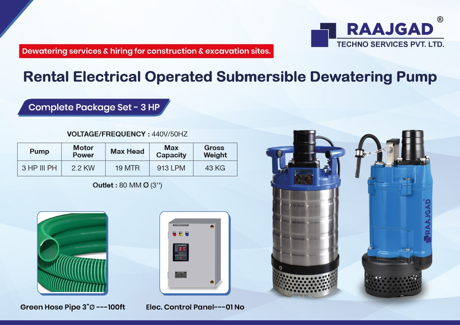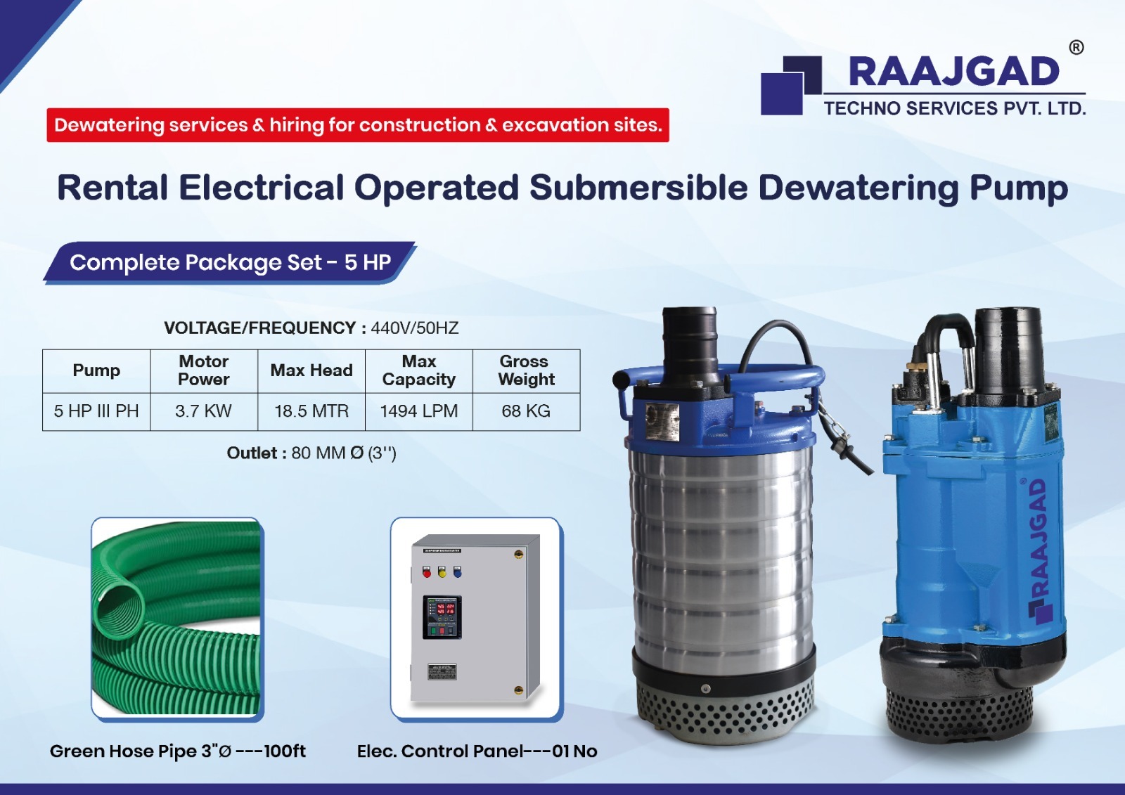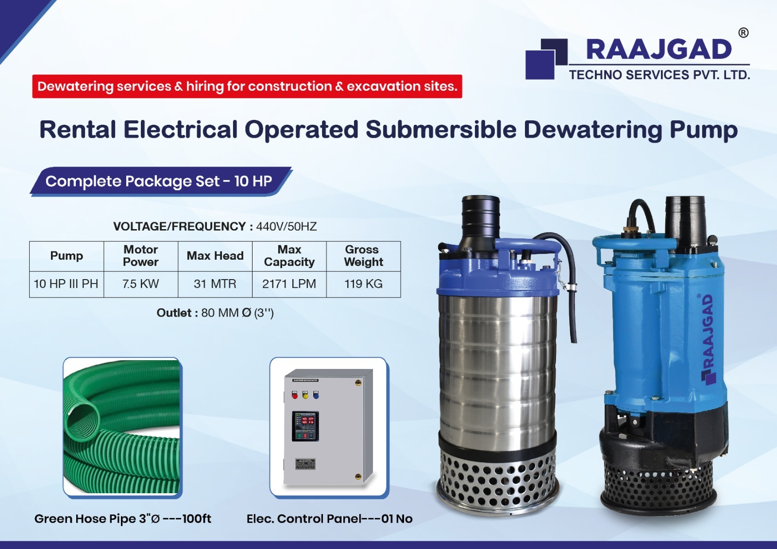 Raajgad Pump provides Submersible Pumps, Sludge Pumps for construction & excavation sites. Our dewatering rental services includes electrical Submersible mud pumps ranging from 1 HP to 100 HP, Outlet Size 2” to 10” and is used across many industries & Constructions.
